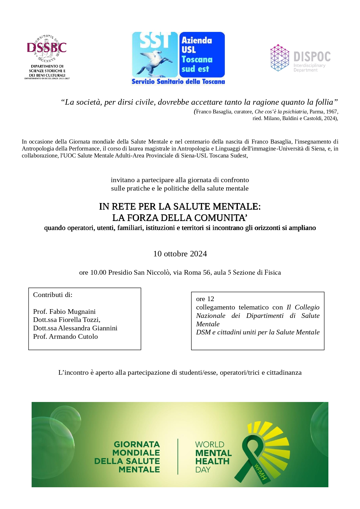L'evento si inquadra nella ricorrenza del Centenario dalla nascita di Franco Basaglia e nella Giornata mondiale della Salute mentale.