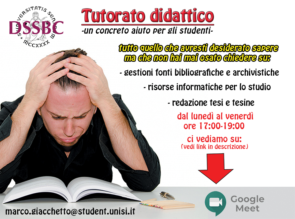 Nella “stanza virtuale” potrete trovare ogni giorno il tutor Marco che attraverso incontri individuali (o collettivi in base al numero) aiuterà gli studenti a comprendere le metodologie delle discipline umanistiche del settore storico e dei beni culturali, formandoli all’uso delle fonti d’archivio o bibliotecarie e all’uso delle risorse informatiche. Il tutorato didattico è pensato per gli studenti del triennio ma vi possono accedere anche quelli della magistrale.