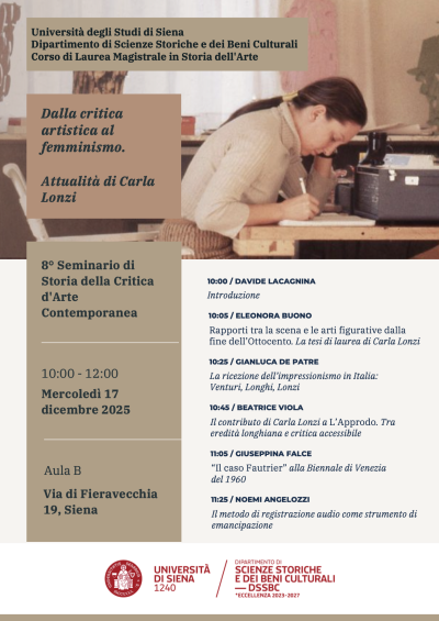 Mercoledì 17 dicembre 2025, a partire dalle ore 10,00, presso l'Aula B di Fieravecchia, si terrà l'8° Seminario di Storia della critica d'arte contemporanea, dedicato quest'anno al tema «Dalla critica artistica al femminismo: attualità di Carla Lonzi».