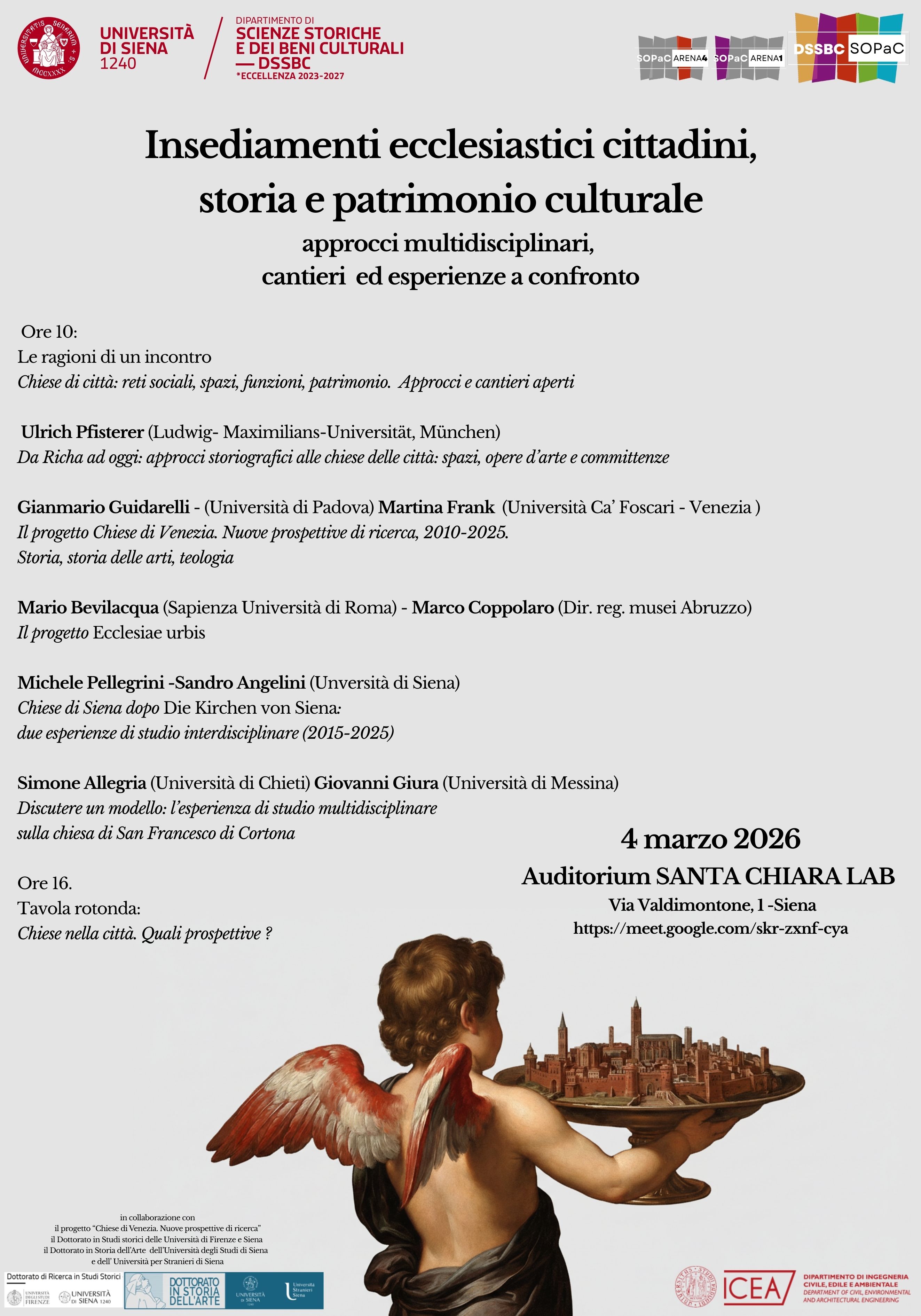 Attorno al tavolo storici, archivisti, storici dell’arte e dell’architettura, impegnati in alcuni dei maggiori progetti di ricerca interdisciplinare sulle chiese delle grandi città italiane, cominciando da Venezia e da Roma per arrivare a Siena e al territorio toscano. Perché le chiese che segnano lo spazio delle città storiche sono state per secoli i veri snodi di quelle reti di presenze, funzioni ed idee che strutturavano la vita e la socialità urbana.