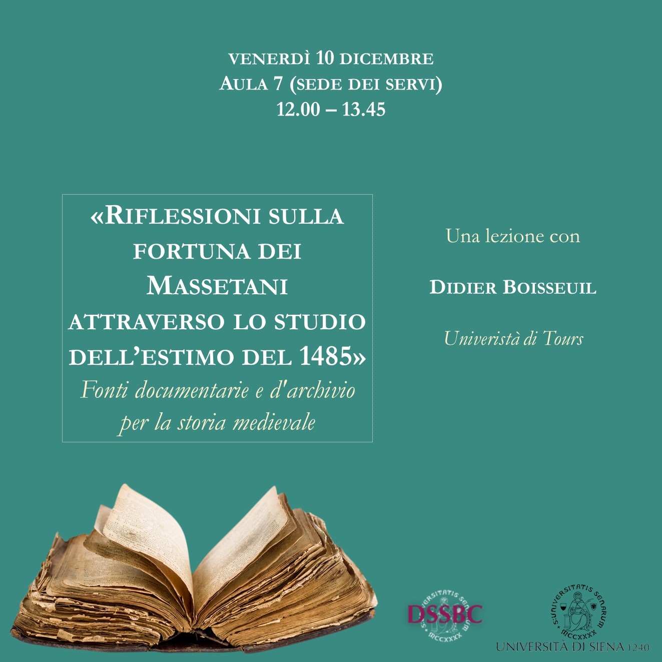 “Riflessioni sulla fortuna dei Massetani attraverso lo studio sull’estimo del 1485” – venerdì 10 Dicembre ore 12 Aula 7 Palazzo Funaioli Mazzi