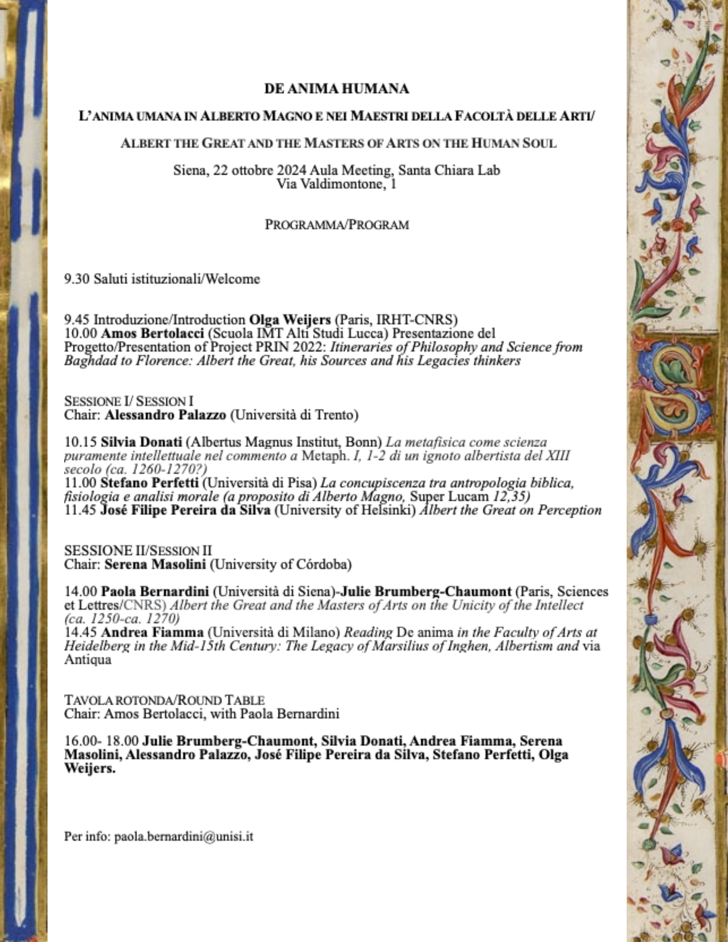 “De anima humana. L’anima umana in Alberto Magno e nei Maestri della Facoltà delle Arti/ Albert the Great And the Masters of Art on the Human Soul”.