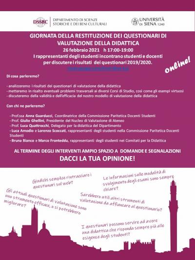 In occasione della GIORNATA DELLA RESTITUZIONE DEI QUESTIONARI DI VALUTAZIONE DELLA DIDATTICA i rappresentanti degli studenti dei corsi di Laurea triennale e magistrali del Dipartimento di Scienze Storiche e dei Beni Culturali incontreranno studenti e docenti per discutere i risultati dei questionari 2019/2020.