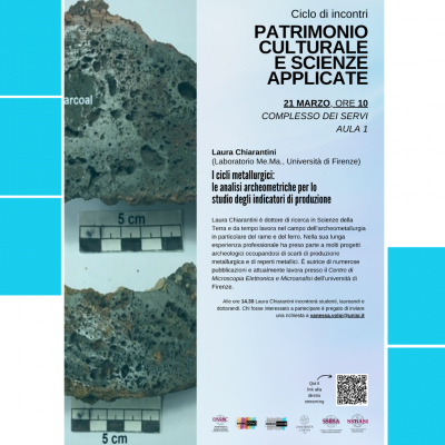 Laura Chiarantini (Università di Firenze, laboratorio Me.Ma) terrà una lezione dal titolo "I cicli metallurgici: le analisi archeometriche per lo studio degli indicatori di produzione" all'interno del ciclo di incontri organizzati dall'arena 5, Patrimonio Culturale e Scienze Applicate.