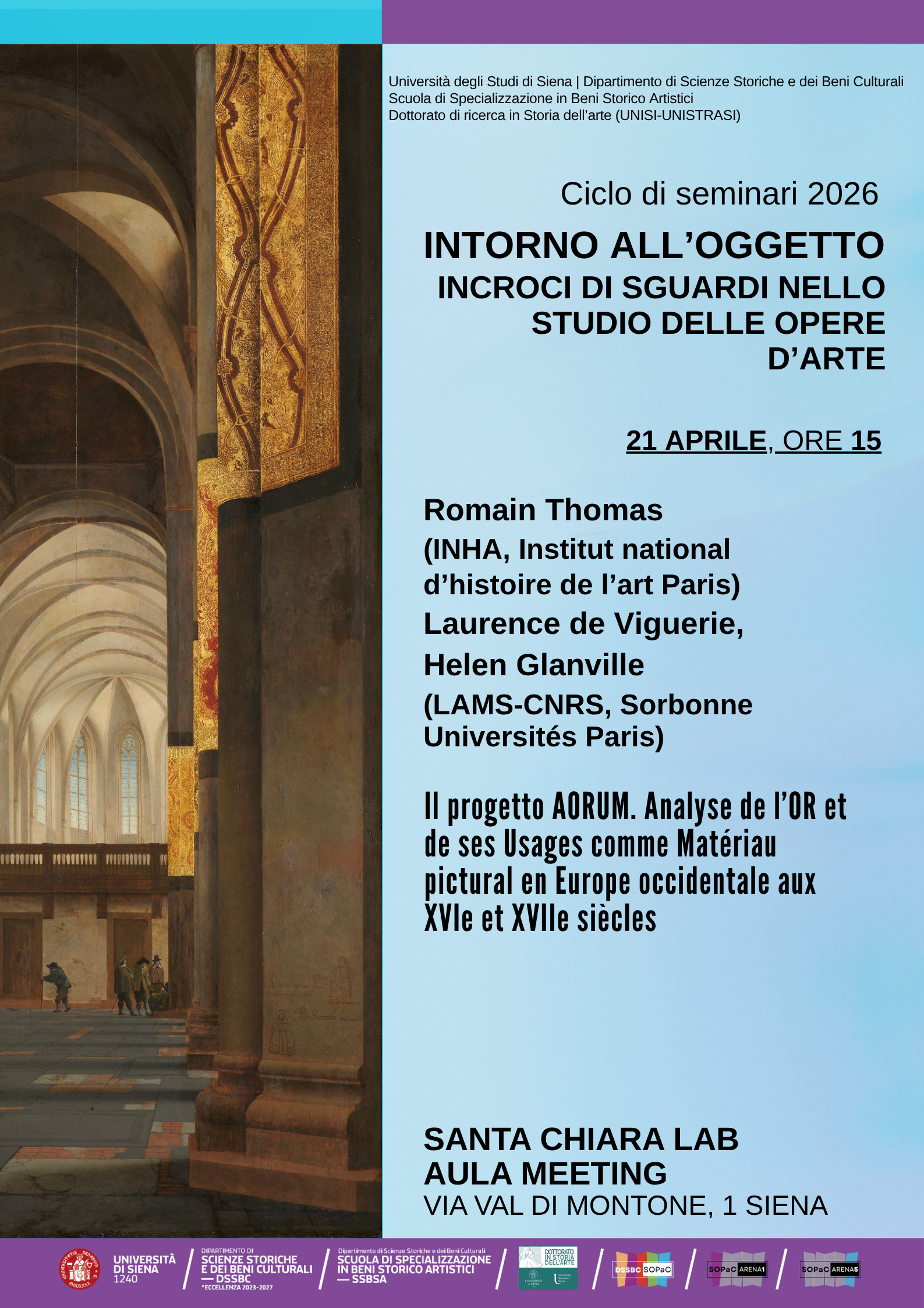 Romain Thomas, storico dell'arte (Università Paris Nanterre), Laurence de Viguerie, ricercatrice scientifica (CNRS; LAMS), e Helen Glanville, linguista e restauratrice (Università di Oxford), ci parleranno del progetto AORUM, rivolto a studiare l’oro come materiale pittorico nelle pratiche artistiche dell’Europa occidentale nel XVI e XVII secolo: di natura interdisciplinare, ha approfondito un terreno storiografico inesplorato, raccogliendo un corpus di opere e analizzandolo in una triplice prospettiva (storica, tecnica e ottica)