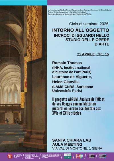 Intorno all'oggetto. Incroci di sguardi nello studio delle opere d'arte è un ciclo di incontri dedicati allo studio delle tecniche esecutive, al restauro e alle analisi scientifiche come strumenti conoscitivi del patrimonio artistico. Storici dell'arte, scienziati, conservatori e restauratori illustreranno specifici casi e progetti di ricerca, mettendo in luce l’apporto degli studi tecnici e scientifici all’indagine storico artistica, a fianco degli altri strumenti della disciplina.