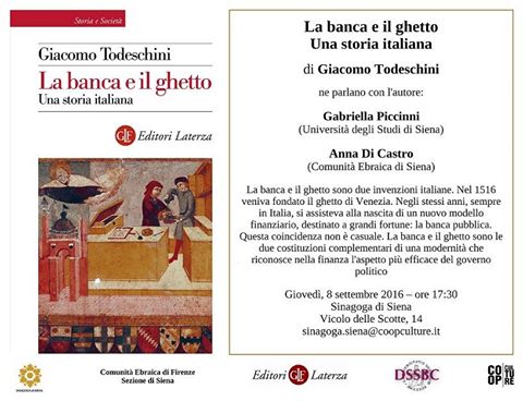 Ne parlerà l'autore Giacomo Todeschini con Gabriella Piccinni (Università degli Studi di Siena) e con Anna di Castro (Comunità ebraica di Siena)