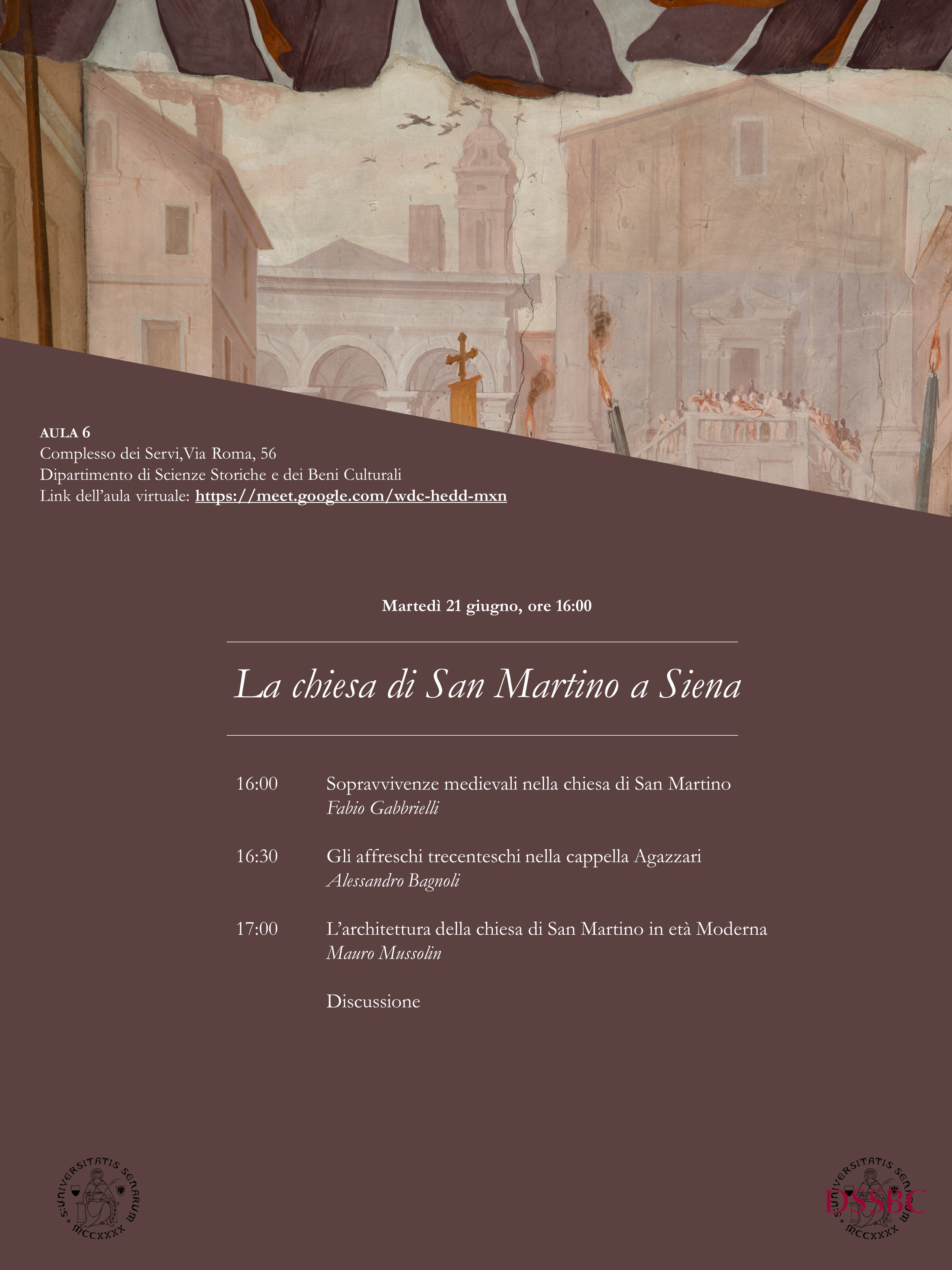 Ad un anno di distanza dalla prima giornata di studio incentrata sulla chiesa di San Martino a Siena, che ebbe luogo presso l’Aula Magna del Rettorato dell’Università degli Studi di Siena (10 giugno 2021), il Dipartimento di scienze storiche e dei beni culturali, in accordo con la Parrocchia di San Martino e con l’Istituto per la valorizzazione delle Abbazie storiche della Toscana, dedica una seconda iniziativa di studio a questo complesso monumentale officiato un tempo dagli agostiniani di Lecceto. Questa seconda occasione di studio è rivolta specificamente all’esame delle sopravvivenze architettoniche di età medievale nella chiesa e nel convento, che verranno illustrate da Fabio Gabbrielli e alla decorazione trecentesca ad affresco della Cappella Agazzari, oggetto della relazione di Alessandro Bagnoli. solinL’aspetto architettonico del complesso ecclesiastico, che risale prevalentemente alla prima età moderna, sarà preso in considerazione nell’intervento di Mauro Mussolin.