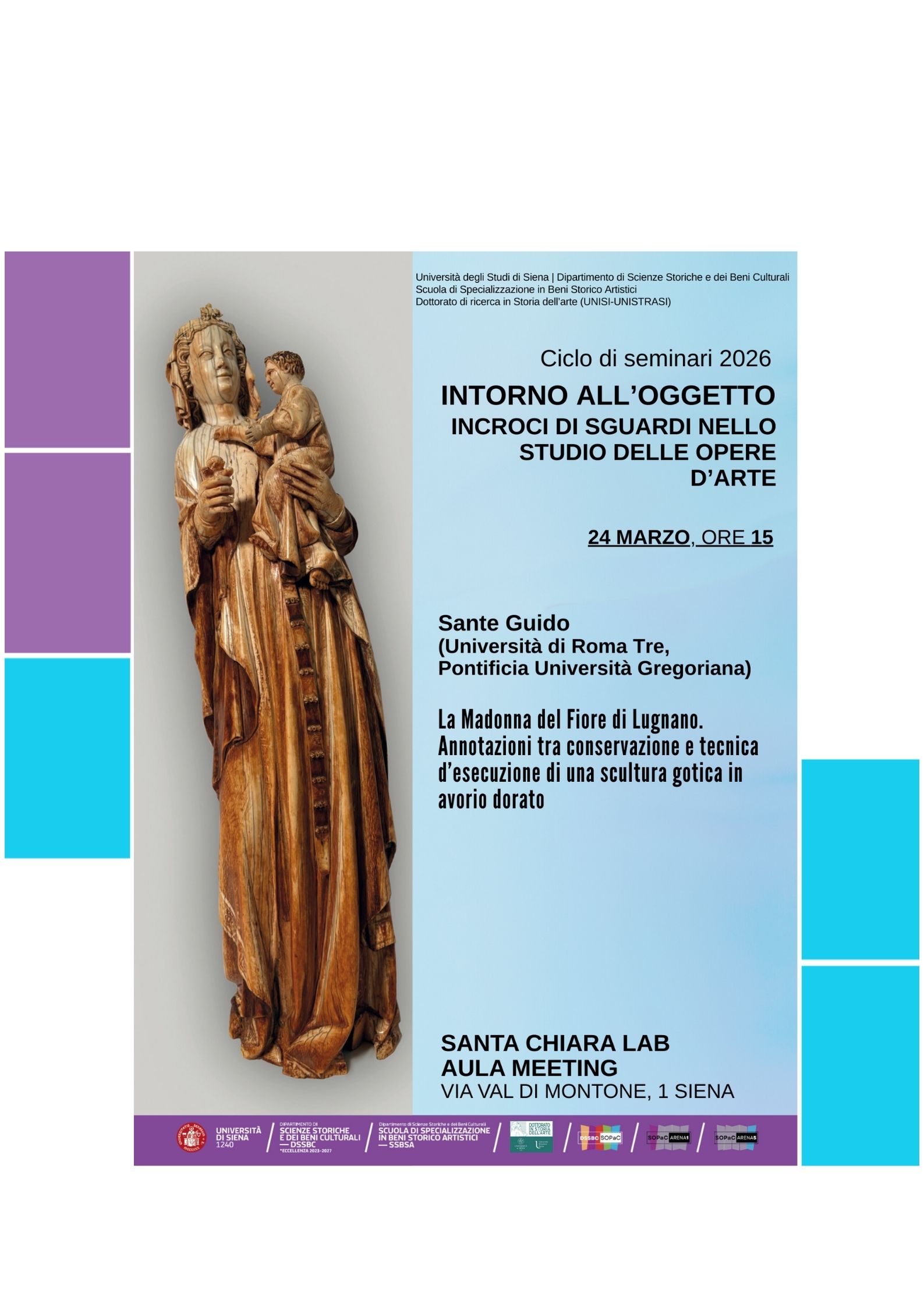 Sante Guido (Università Roma Tre - Pontificia Università Gregoriana) restauratore conservatore, ci parlerà del recente intervento conservativo de La Madonna del Fiore di Lugnano, una scultura gotica francese in avorio dorato. L’analisi è occasione di un approfondimento su avorio ed osso quali materiali organici largamente utilizzati, in alcuni periodi storici, per produzione di manufatti artistici.