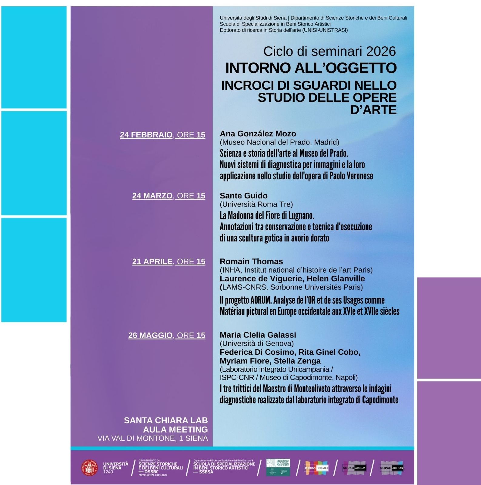 Gli incontri, nell'ambito del SOPAC, sono curati dall'Arena 1 e dall'Arena 5 in collaborazione con la Scuola di Specializzazione in Beni Storico Artisti.