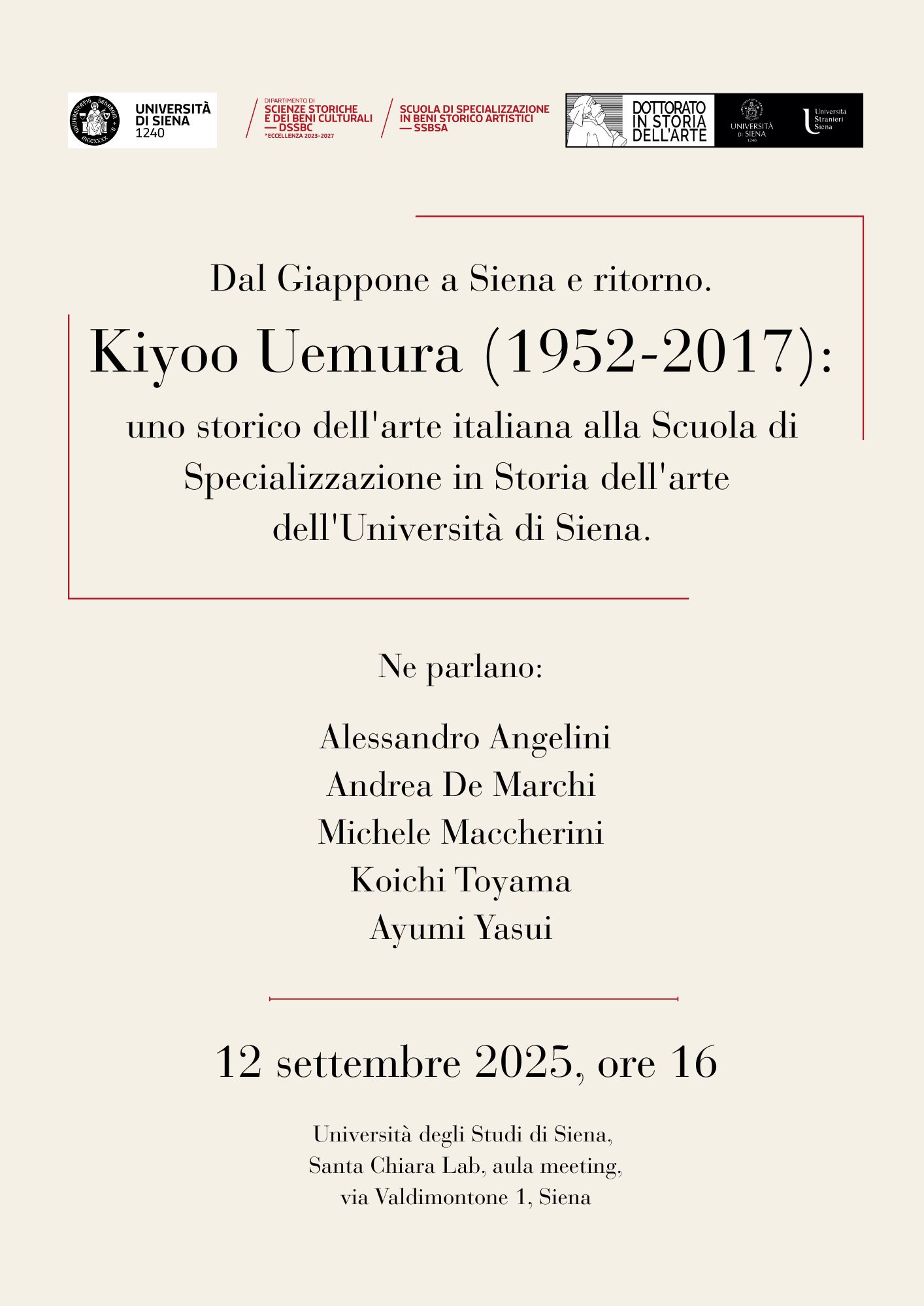 Venerdì 12 settembre, a partire dalle ore 16,00, in Aula Meeting al Santa Chiara Lab (via di Valmontone, 1), la Scuola di Specializzazione in Beni Storico Artistici dell'Università di Siena ricorderà la figura di Kiyoo Uemura (1952-2017), ex allievo della Scuola e docente in varie università del Giappone.