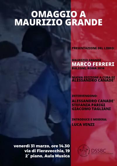 Venerdì 31 marzo, presso l'Aula Musica di Palazzo Fieravecchia, il Dipartimento di Scienze storiche e dei Beni culturali lo ricorda, a poco più di vent'anni dalla sua prematura scomparsa, con la presentazione di uno dei suoi libri, recentemente rieditato presso Bulzoni. Si tratta dello studio su Marco Ferreri (1974, poi 1980), apparso in una nuova edizione (2016, a cura di Alessandro Canadè, introduzione di Roberto De Gaetano), aggiornata e integrata con numerosi saggi - tra cui un inedito - che Grande consacrò al cineasta tra gli anni '80 e i primi anni '90.