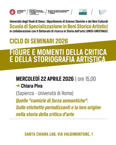 Nell'ambito dell'attività didattica della Scuola di Specializzazione in Beni Storico Artistici, in collaborazione con il Dottorato di ricerca in Storia dell'arte dell'Università degli Studi di Siena e dell'Università per Stranieri di Siena, mercoledì 22 aprile 2026, alle ore 15,00, presso l'Aula Meeting del Santa Chiara Lab (Siena, via Valdimontone, 1), Chiara Piva (Sapienza - Università di Roma) interverrà sul tema: