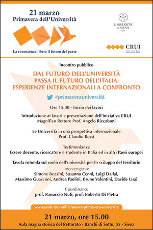 Il 21 marzo 2016 alle ore 15.00 presso l’Aula magna storica del Rettorato (Banchi di Sotto, 55 a Siena) si svolgerà un incontro pubblico, dal titolo "Dal futuro dell'Università passa il futuro dell'Italia. Esperienze internazionali a confronto" che vuole informare sul ruolo dell’Università in questi processi di cambiamento e di rinnovamento, assumendo una logica di confronto internazionale.