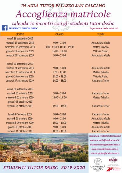 Lunedì, 16 Settembre 2019Gli studenti tutor incontrano le matricole Gli studenti tutor incontrano le matricole del Dipartimento di Scienze Storiche e dei Beni Culturali. Il calendario prevede incontri ogni settimana fino a metà ottobre.
