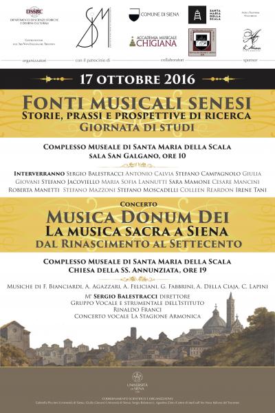 Una giornata di studio e ascolto sulle antiche musiche senesi, organizzata il 17 ottobre dal Dipartimento di Scienze Storiche e dei Beni culturali dell'Università di Siena insieme all'Istituto Italiano di Storia della musica: "Fonti musicali senesi. Storie, prassi e prospettive". A seguire "Musica donum Dei. La musica sacra a Siena dal Rinascimento al Settecento", concerto alla chiesa della SS. Annunziata, con il M° Sergio Balestracci.