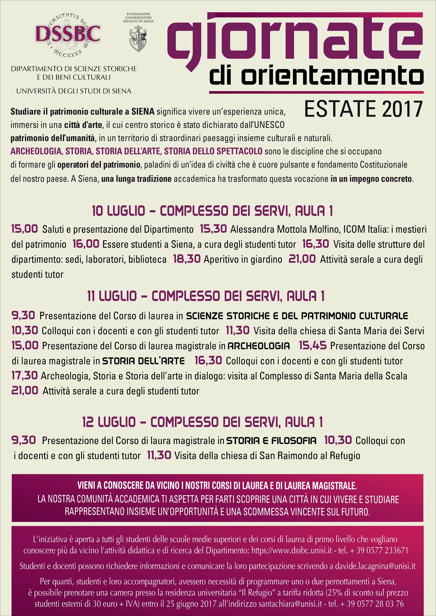 Dal 10 al 12 luglio si terranno le giornate di orientamento organizzate dal dipartimento di Scienze storiche e dei beni culturali e dedicate alle discipline che si occupano di formare gli operatori del patrimonio: Archeologia, Storia, Storia dell'arte e Storia dello spettacolo.