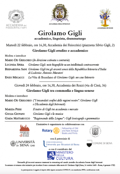 Le tre accademie cittadine, dei Fisiocritici 1691, degli Intronati e dei Rozzi, in collaborazione con l’Archivio di Stato di Siena, il Rotary club e la Società Bibliografica Toscana, organizzano due giornate di studio dedicate a Girolamo Gigli.