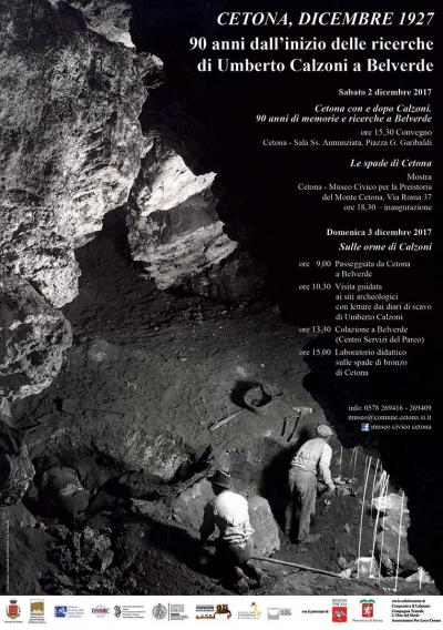 In occasione della ricorrenza dei 90 anni dall’inizio delle ricerche archeologiche di Umberto Calzoni a Belverde, il Comune di Cetona, insieme all’Università di Siena e ad altri partner istituzionali e scientifici, si è reso promotore di due giornate di iniziative che vogliono ricordare lo studioso perugino e divulgare i risultati delle recenti ricerche archeologiche avviate dall'Università degli Studi di Siena attraverso il Dipartimento di Scienze storiche e dei beni culturali e il CRISP, Centro di Ricerca Interuniversitario Studio e Valorizzazione delle Culture, Tecnologie e Paesaggi Preistorici. Le informazioni ricavate dalle ricerche di Umberto Calzoni sono state un patrimonio di riferimento per tutta la Preistoria italiana. Dopo lunghi anni di silenzio e inattività, dal 1984 inizia un nuovo progetto di indagine che unisce l’allora Soprintendenza per i Beni Archeologici della Toscana, l’Università di Siena, l’amministrazione comunale di Cetona e l’allora Comunità Montana del Cetona. Negli anni successivi, grazie al coinvolgimento della Regione Toscana e della Provincia di Siena, vengono conseguiti risultati di grande importanza scientifica che hanno avuto una ricaduta anche sull'offerta storica e culturale di Cetona: lo studio quasi integrale dei reperti provenienti dalle ricerche di Calzoni; l’apertura di nuove aree di scavo a Belverde dal 1984 al 2004; la realizzazione del Museo Civico per la Preistoria del Monte Cetona nel 1990, dotato di un nuovo e più moderno allestimento dal 2014; la costituzione del Parco archeologico-naturalistico di Belverde, ancora nel 1990, primo esempio toscano di unione fra patrimonio archeologico e ambientale, e la realizzazione dell’Archeodromo di Belverde, nel 2007, come struttura capace di far immergere i visitatori nella Preistoria grazie ad attente ricostruzioni di ambienti e modi di vita e ad attività di archeologia sperimentale e simulativa in collaborazione con l'Università degli Studi di Siena.