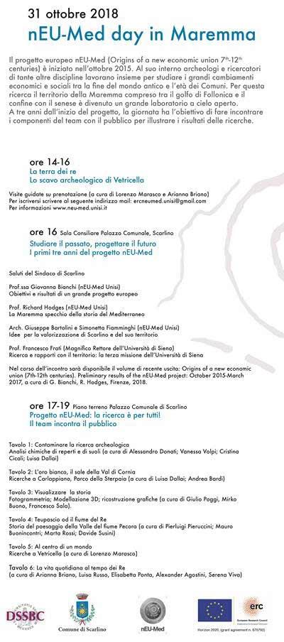 Il progetto europeo nEU-Med (Origins of a new economic union 7th-12th centuries) è iniziato nell’ottobre 2015. Al suo interno archeologi e ricercatori di tante altre discipline lavorano insieme per studiare i grandi cambiamenti economici e sociali tra la fine del mondo antico e l’età dei Comuni. Per questa ricerca il territorio della Maremma compreso tra il golfo di Follonica e il confine con il senese è divenuto un grande laboratorio a cielo aperto.