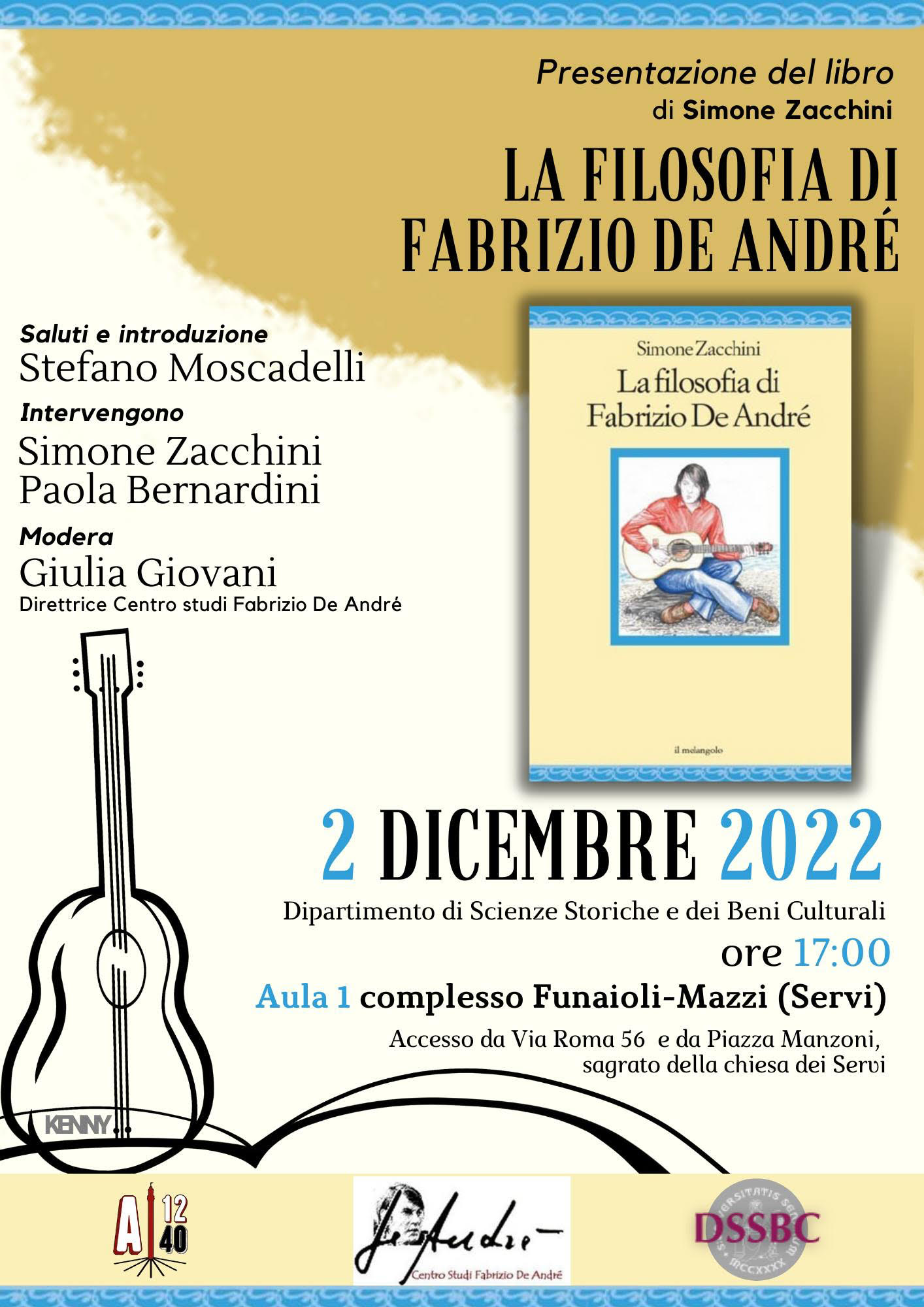 La presentazione è organizzata dall'associazione Aula1240 con il patrocinio del Dipartimento e del Centro Studi Fabrizio De André.
