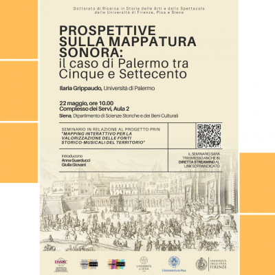 Il 22 maggio, alle 10:00, l’Aula 2 del Complesso dei Servi ospiterà un seminario della Dottoressa Ilaria Grippaudo (Università di Palermo) dedicato alle Prospettive sulla mappatura sonora: il caso di Palermo tra Cinque e Settecento. Il seminario sarà introdotto dalle Prof.sse Anna Guarducci e Giulia Giovani.