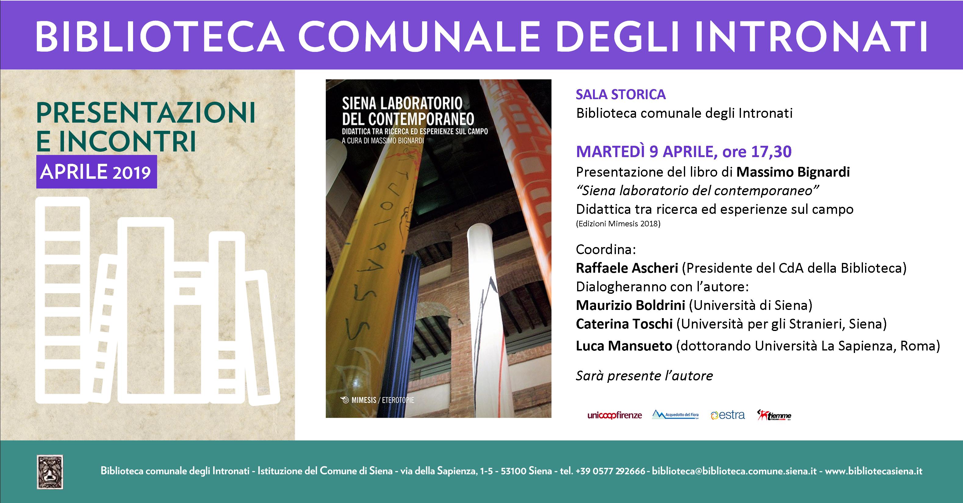 Martedì 9 aprile alle ore 17:30 sarà presentato presso la Sala storica della Biblioteca comunale degli Intronati di Siena, il libro curato da Massimo Bignardi SIENA LABORATORIO DEL CONTEMPORANEO. Didattica tra ricerca ed esperienze sul campo (Edizioni Mimesis, 2018), che raccoglie le esperienze del laboratorio di storia dell’arte contemporanea che il prof. Bignardi ha organizzato con i suoi allievi dell’Università di Siena, tra il 2007 e il 2017.
