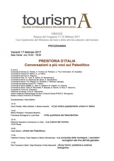 Venerdì, 17 Febbraio 2017 Venerdì 17 Febbraio ore 14 conferenza su PREISTORIA D’ITALIA Conversazioni a più voci sul Paleolitico Tourisma Salone Internazionale dell'Archeologia Firenze Palazzo dei Congressi per info www.tourisma.it programma_tourisma_paleolitico.jpg